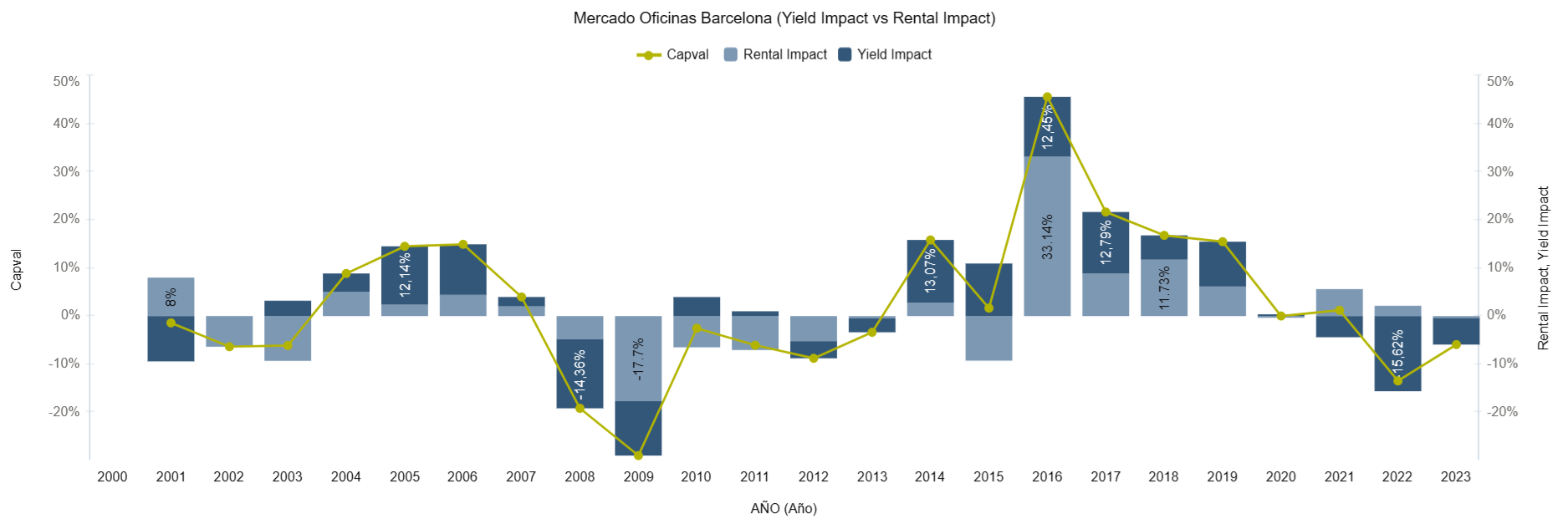 Analizando la evolución de la valoración de los activos prime, continua el ajuste de precios por la subida de las tasas de capitalización exigidas. Los 105 bps de incremento de los últimos cuatro trimestres se traducen en ajustes de valor vía «denominador» de alrededor del 21% acumulado. Son previsibles nuevos ajustes hasta que el mercado no perciba que los tipos de interés (BCE) han llegado a su «techo». Es bueno recordar que, como muestra el gráfico, todo incremento de valor «vía rentas» se afianza en el tiempo y todo incremento de valor «vía yields» tiende a neutralizarse a lo largo del ciclo inmobiliario completo.
