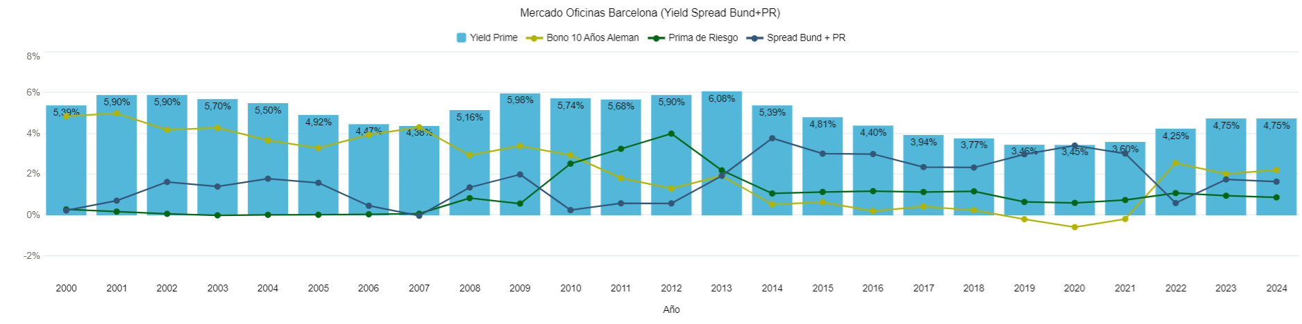El spread «Yield prime» Vs «Bund + Prima de riesgo» se encuentra a niveles de 1,53% (al igual que en el mercado de Madrid) ha presentado un ligero descenso con respecto al último trimestre del 2023 y a la espera que la desescalada de tipos proporcione al sector un spread superior de más atractivo sobre inversiones alternativas.
