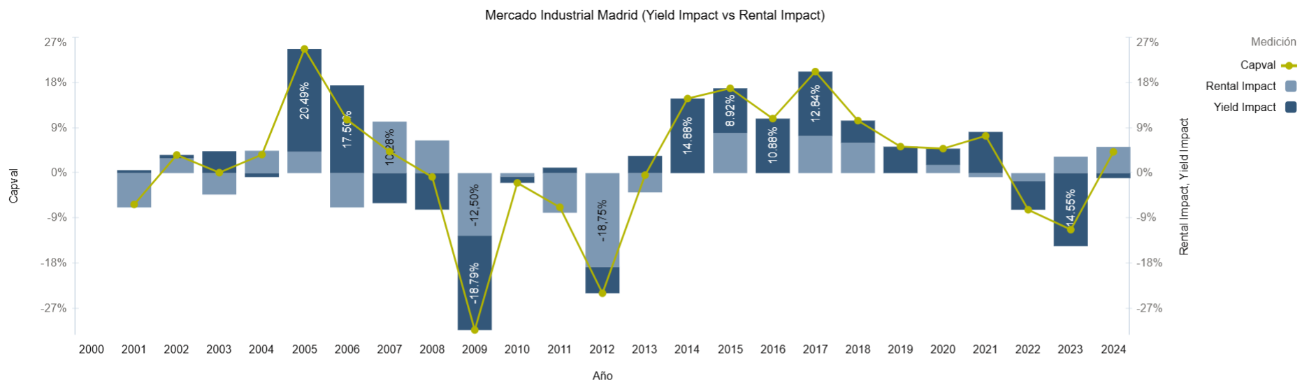 En 2025, la revalorización vía “denominador” se sitúa en torno al 2,23 %, mostrando un aumento notable respecto al trimestre anterior. Este incremento refleja una bajada en las tasas de capitalización exigidas, lo que ejerce presión al alza sobre la valoración de los activos prime.