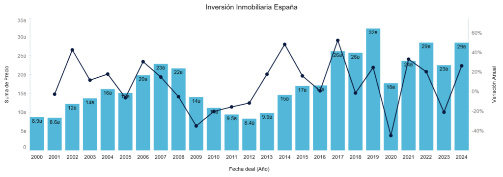 Durante el tercer trimestre de 2025, la inversión inmobiliaria ha experimentado una desaceleración respecto el segundo trimestre, donde la inversión tuvo un repunte inusual respecto de los últimos trimestres . En total, se ha alcanzado un volumen de inversión de 4.300 M€, lo que supone descenso interanual del 4,4% respecto al tercer trimestre de 2024 y una caída intertrimestral del 43,4% frente al segundo trimestre de 2025. Este decrecimiento coyuntural, se debe principalmente a que el sector hotelero ha vuelto a números estacionarios tras un ajuste respecto a un segundo trimestre cargado de operaciones.
