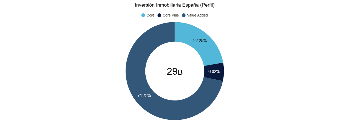 Dentro de las diferentes estrategias de inversión, la distribución observada se mantiene en línea con la tendencia de los últimos años: la estrategia value added concentra el 70,17 % del total, seguida de la estrategia core con un 26,79 %, mientras que core plus representa el 3,04 % restante.