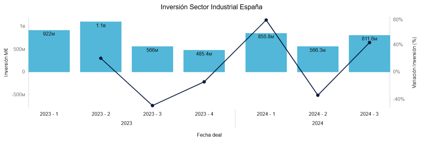A lo largo de este trimestre, el sector industrial Español a registrado una inversión de 670,2 M€ (datos algoritmo DAO addmeet). Dicha cifra representa un crecimiento del 26,67 % frente al trimestre previo. Comparado con el mismo periodo del año anterior, el aumento fue del 16%, reflejando signos de reactivación.