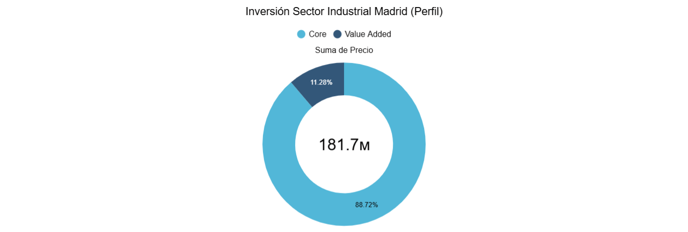 En cuanto a la distribución de las estrategias de inversión en el sector industrial de Madrid, el 79,52 % se ha destinado a value added, siguiendo la tendencia marcada a inicios de año. Le siguen los activos core, con un 14,93 %, y, por último, la estrategia core plus, que representó el 5,55 % restante.