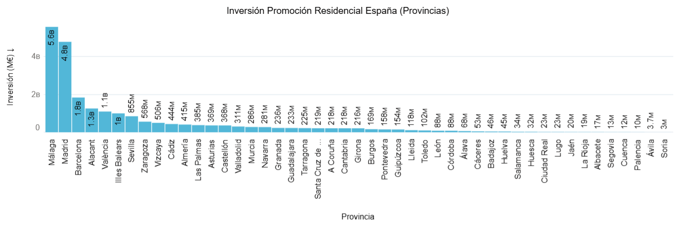 Según se aprecia en el grafico, la provincia de Madrid aglomera el 47,31% de la inversión total. Le siguen las provincias de Valencia (18,16%), Barcelona (14,64%), Sevilla (8,43%) y Toledo (7,56%). Con un impacto notoriamente inferior las provincias de Málaga (1,19%), Navarra (1,15%), Álava (1,03%) y Asturias (0,54%).