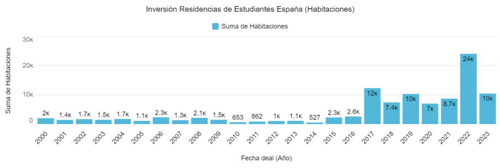 Durante este año se ha invertido en un total de 10.475 habitaciones de residencias de estudiantes en España, aproximadamente un 58% inferior al año anterior, habiendo cerrado el año 2022 con un total de 24.151 habitaciones. Los proyectos en «desarrollo» de mayor volumen son la Residencia Nexo Vallecas (670 hab.) ubicada en Madrid y la Residencia Syllabus Cerdanyola (640 hab.) en Cerdanyola del Vallès en Barcelona, desarrollado por Urbania.